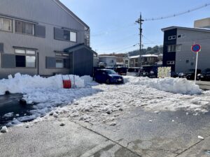 〇寒中お見舞い申し上げます。当店前2台 アスワ第二駐車場3台とも除雪に力を入れております。が、、朝1番は手作業のため不充分な時もございます。電話にてご確認ください